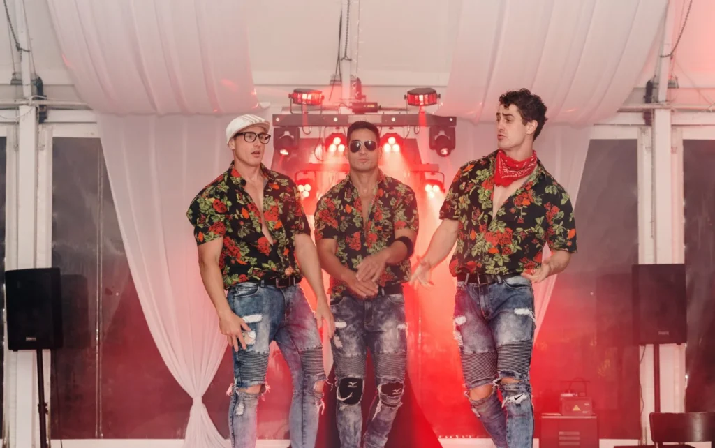 Three performers from the Men of Steel dressed in suits and hats, standing on stage with dramatic lighting at Allely Estate.